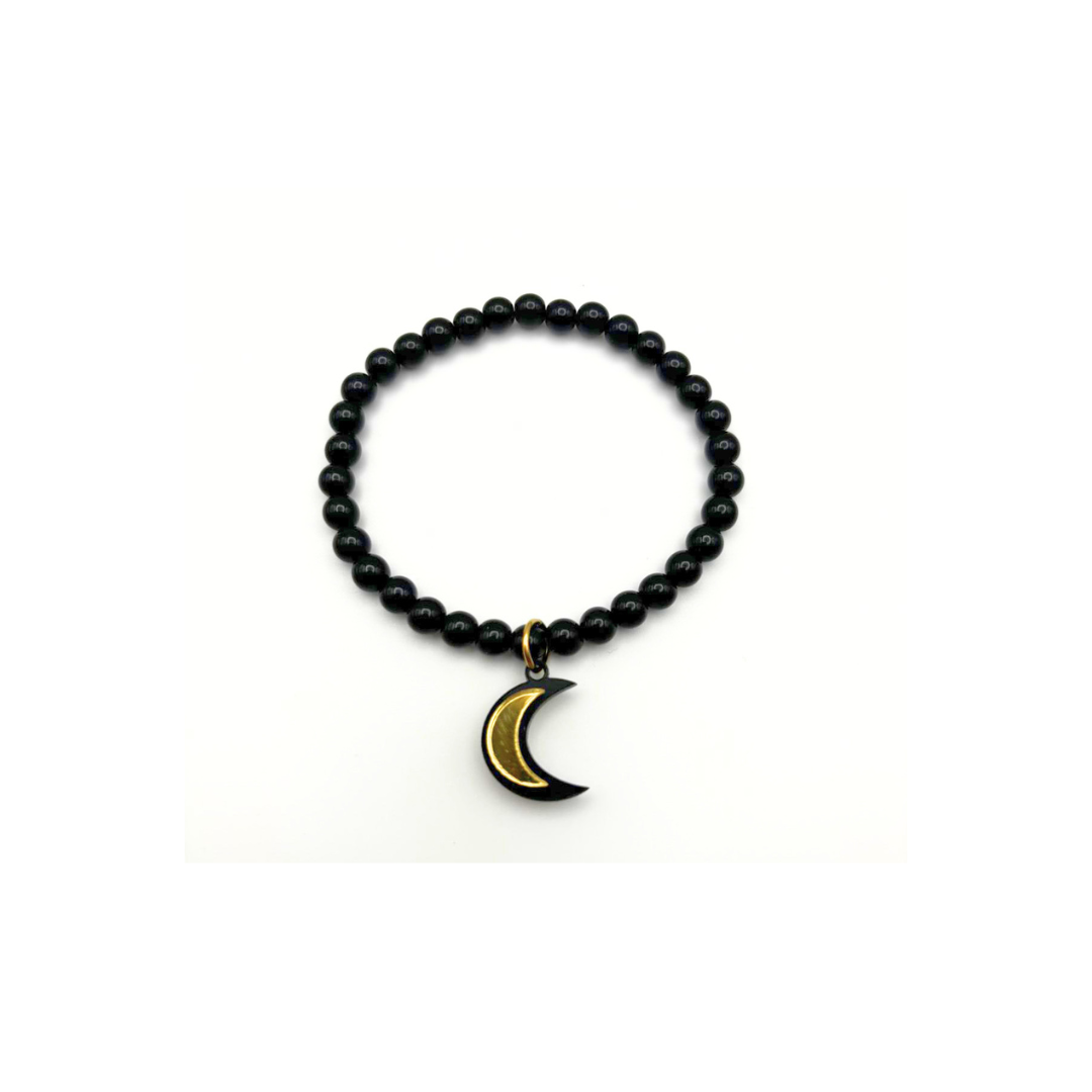 Pulsera de bolitas de resina negras con charm en forma de luna en ambas caras