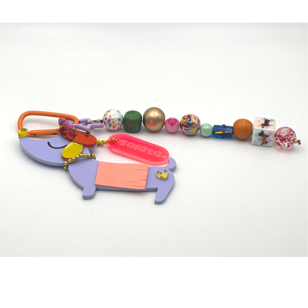 Llavero formado por varios colgantes: perro en metacrilato, tira de abalorios de cerámica y madera y placa con nombre personalizada