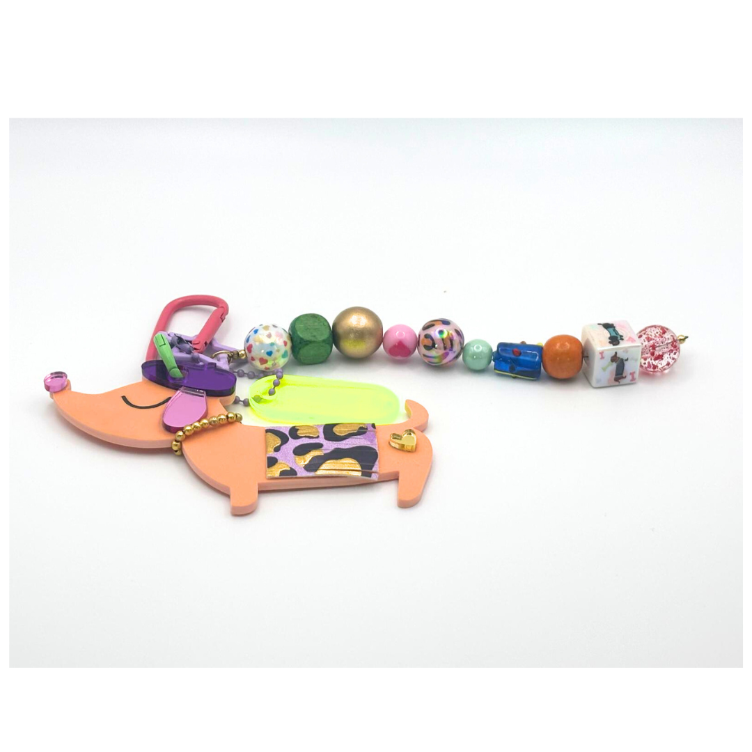 Llavero formado por varios colgantes: perro en metacrilato, tira de abalorios de cerámica y madera y placa con nombre personalizada