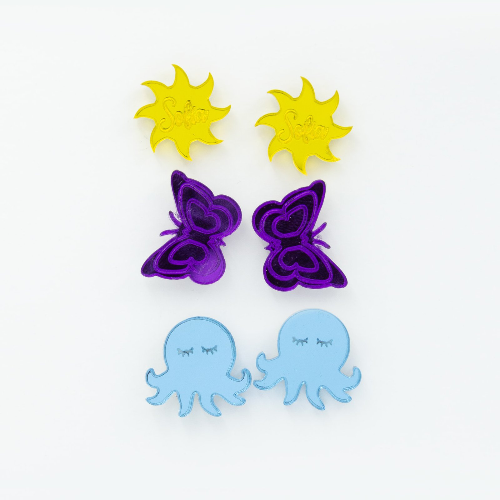Conjunto de pendientes infantil formado por 3 modelos de distinta forma y color y grabado personalizado con el nombre