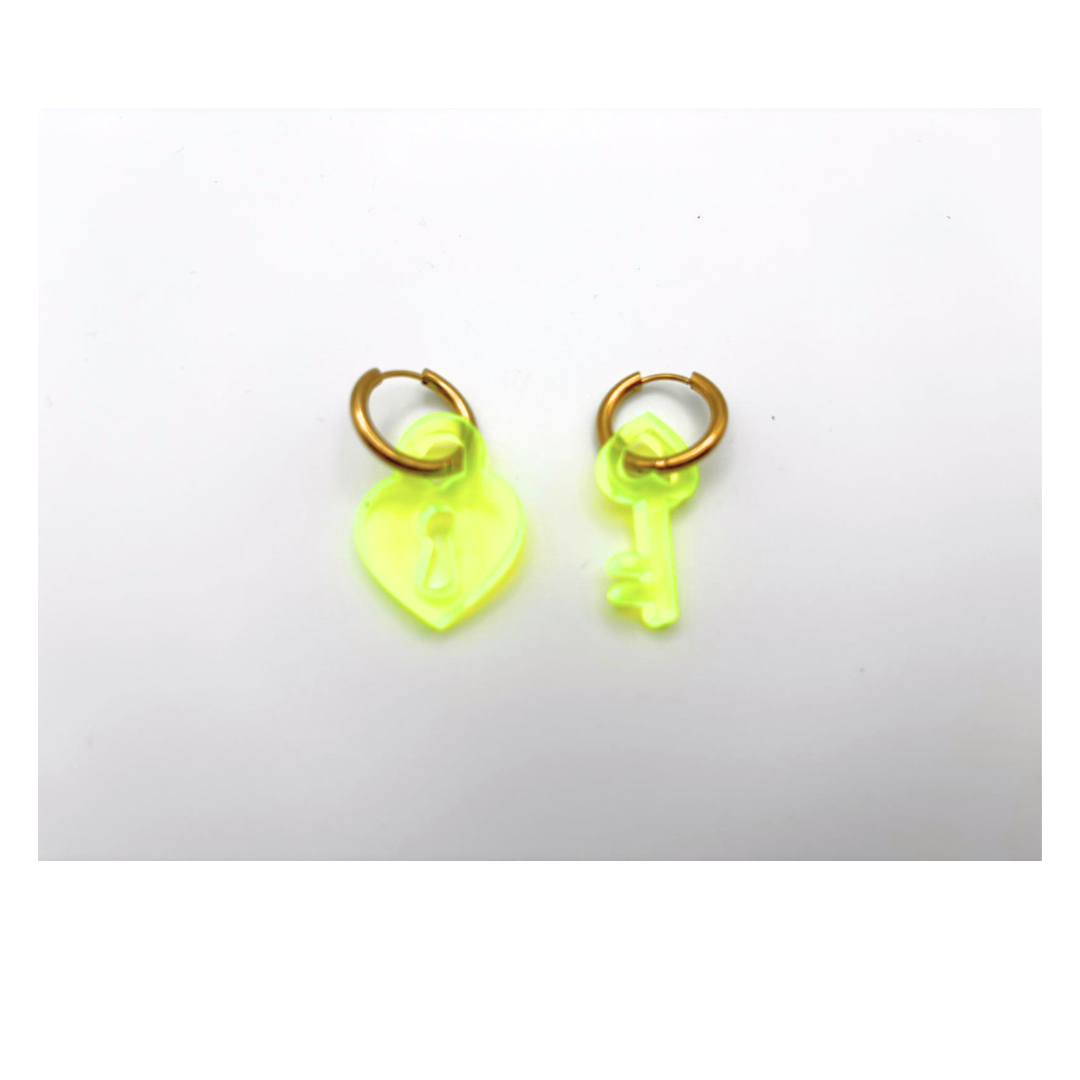 Pendientes con piezas de metacrilato diferentes que simulan un corazon y la llave para abrirlo